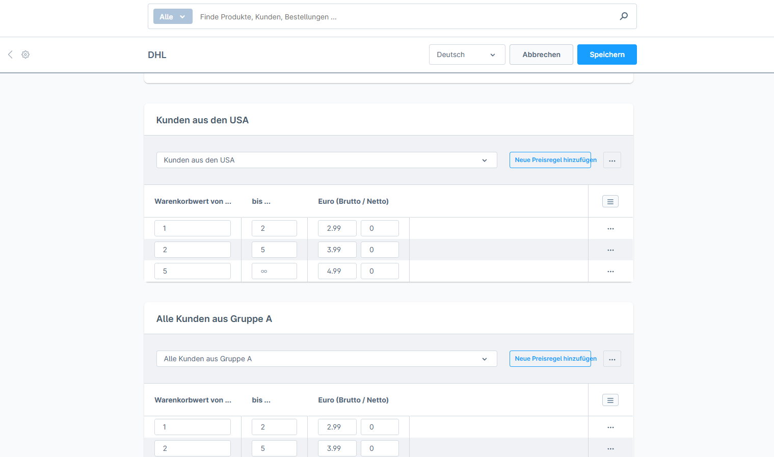 Mit der Preismatrix können Sie die Versandkosten flexibel und präzise gestalten. Sie haben die Möglichkeit, Preisregeln nach Warenkorbwert, Gewicht, Stückzahl oder anderen Eigenschaften festzulegen und diese auf Länder oder Regionen anzupassen. Es ermöglicht Ihnen, mehrere Preisregeln gleichzeitig anzuwenden, wie z. B. Zuschläge (Inselzuschläge) oder Rabatte (z. B. kostenloser Versand ab einem bestimmten Bestellwert). Sie können zudem Bedingungen über den Rule Builder einrichten, um Versandkosten nur bei Erfüllung bestimmter Kriterien (wie Mindestbestellwert oder Gewicht) anzuwenden.